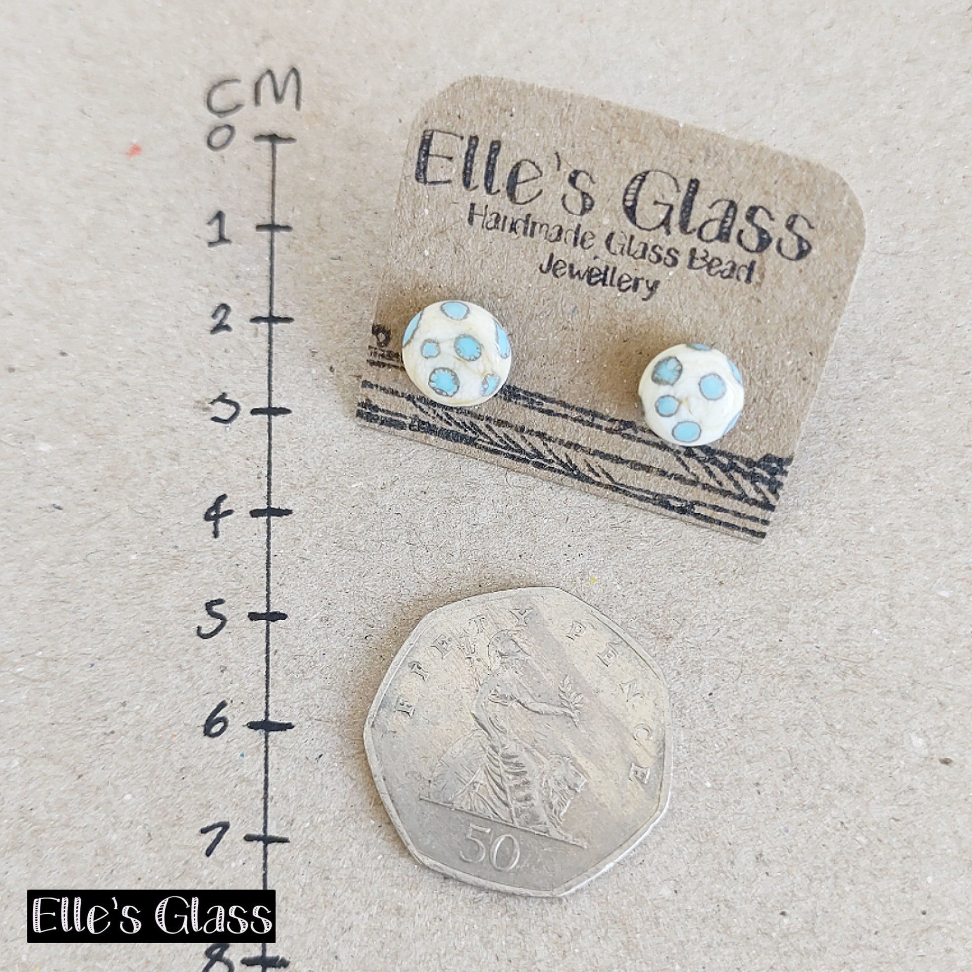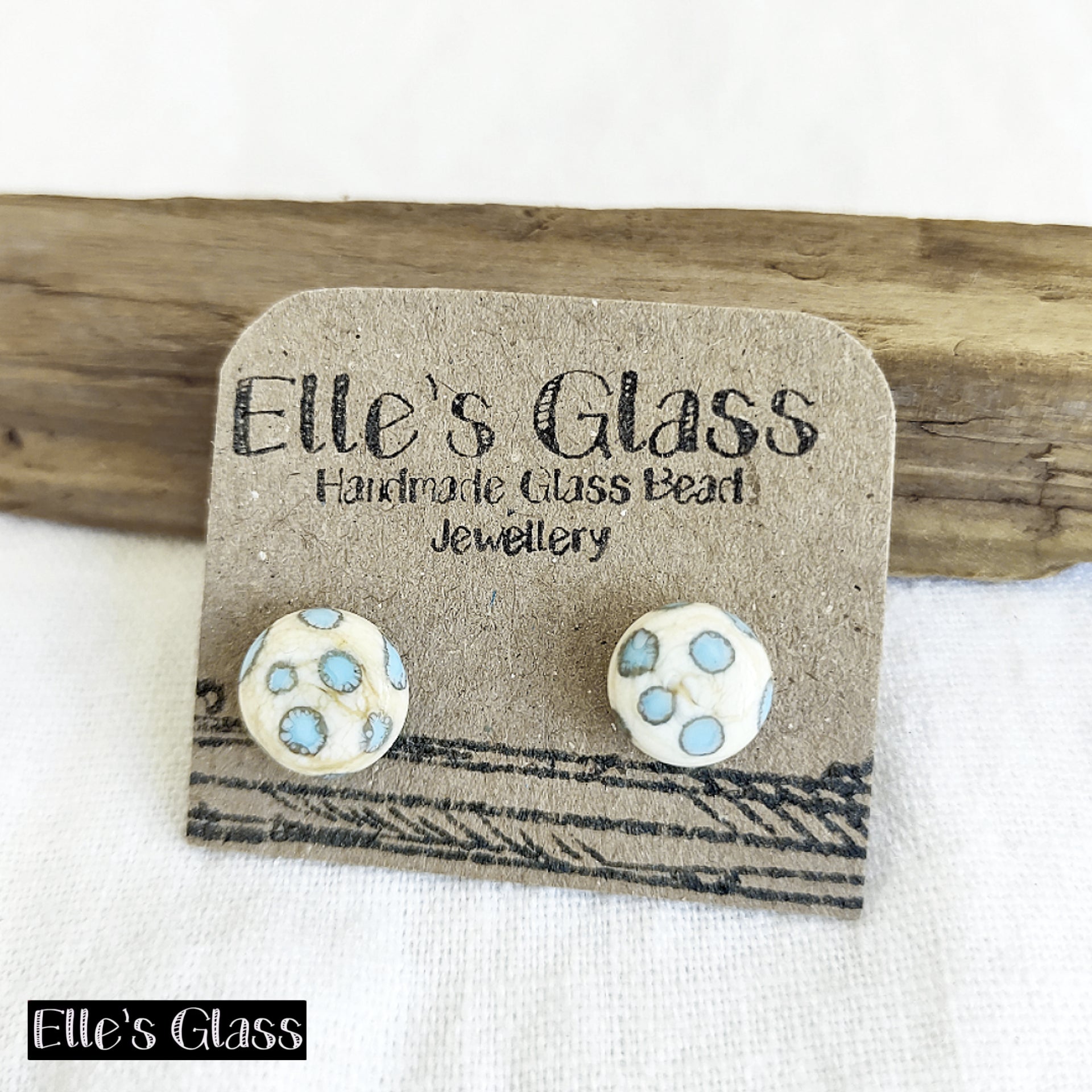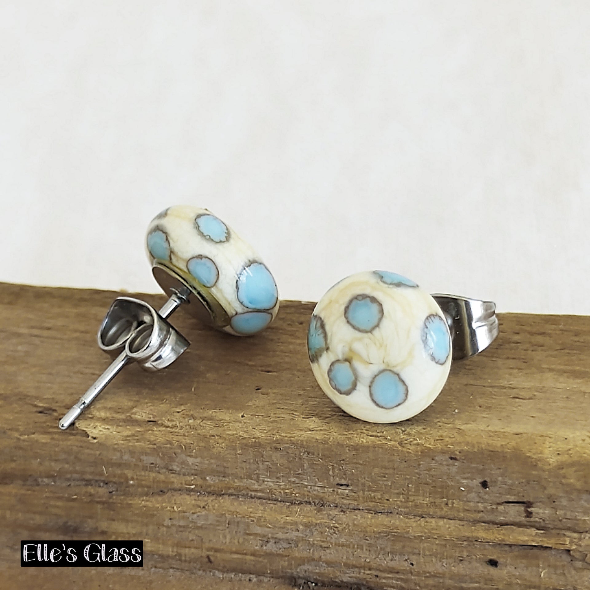 Pretty cream with pale blue polka dot stud earrings. These are handmade from glass with surgical steel backs making them safe for anyone to wear (hypoallergenic). Lightweight and comfortable to wear. Super cute way to accessorise your outfit. Would make a great gift or to treat yourself.