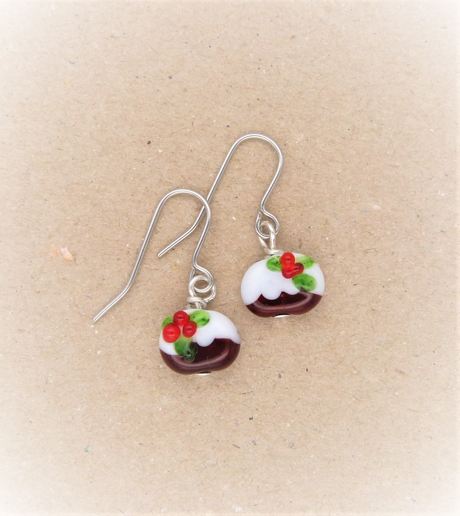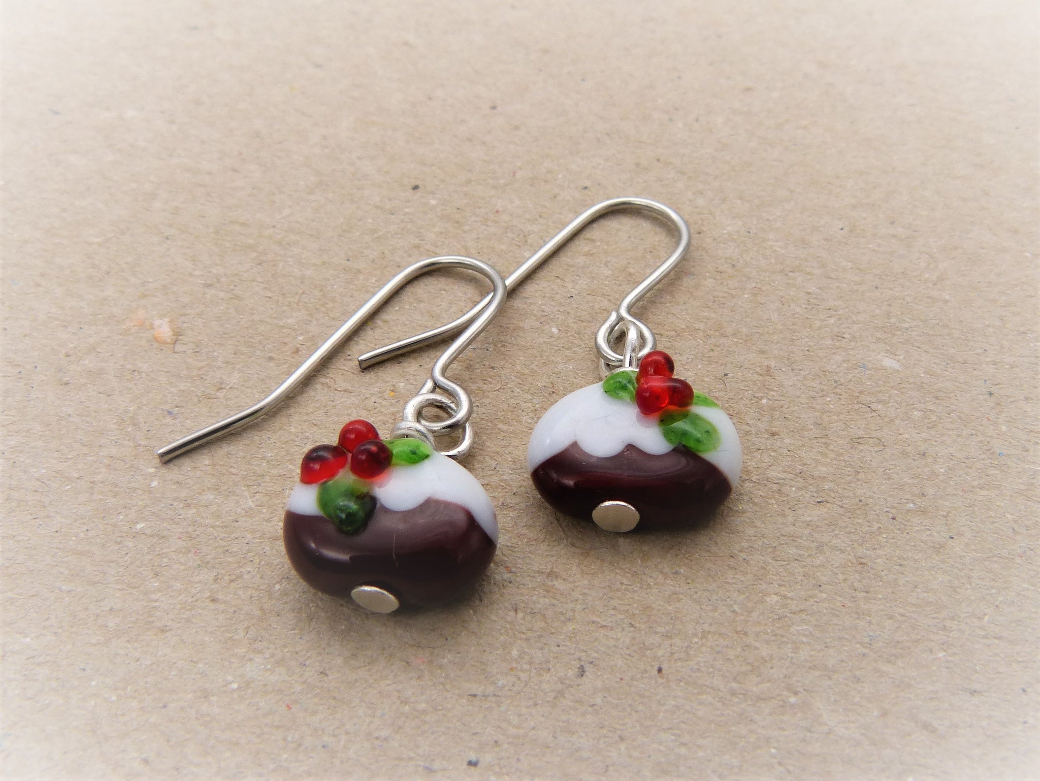 These little christmas puds are handmade lampwork glass with surgical steel wire hooks (hypoallergenic). Great for adding a touch of christmas fun to any outfit or that little something for secret santa.